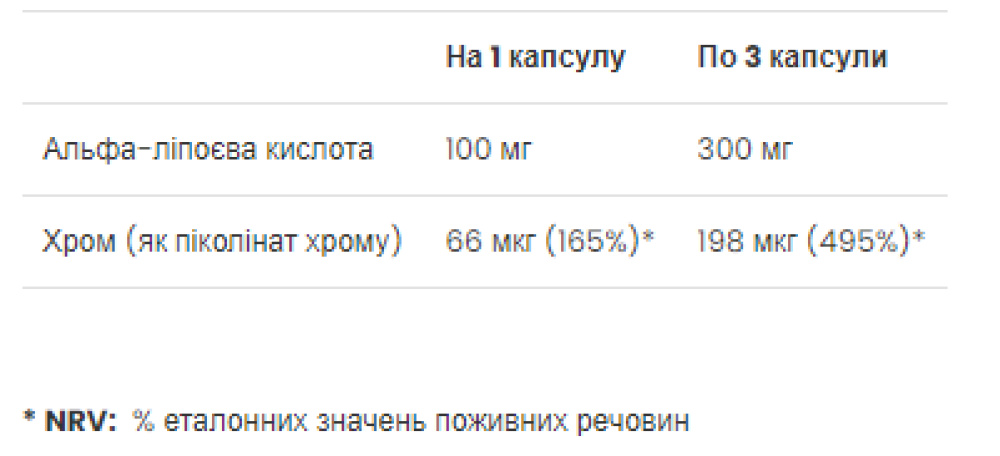 Альфа-ліпоєва кислота - антиоксидант, який міститься в багатьох продуктах і виробляється в нашому організмі природним шляхом. На жаль, з віком кількість альфа-ліпоєвої кислоти зменшується. Крім того, альфа-ліпоєва кислота відіграє важливу роль у перетворенні їжі в енергію, а також у збільшенні чутливості до інсуліну, що допоможе захистити від діабетичних ускладнень. UltraVit Alpha lipoic acid + до складу включений так само хром для підтримки нормального вуглеводного і ліпідного обміну.
