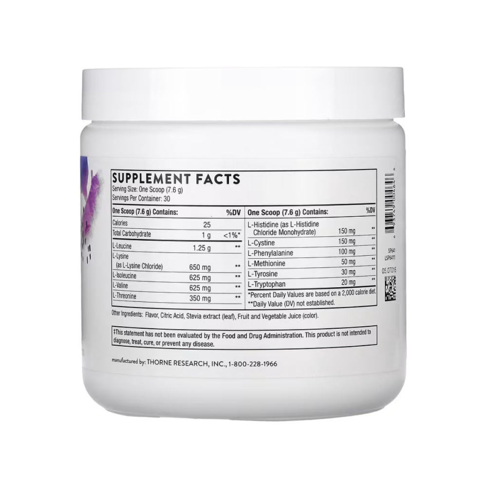 Комплекс амінокислот Thorne є повноцінною сумішшю незамінних амінокислот з високим вмістом амінокислот з розгалуженими ланцюгами (BCAA). Це група амінокислот, яка в результаті клінічних випробувань продемонструвала здатність до стимулювання нарощування сухої м’язової маси та збільшення м’язової сили.