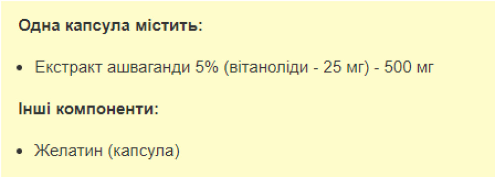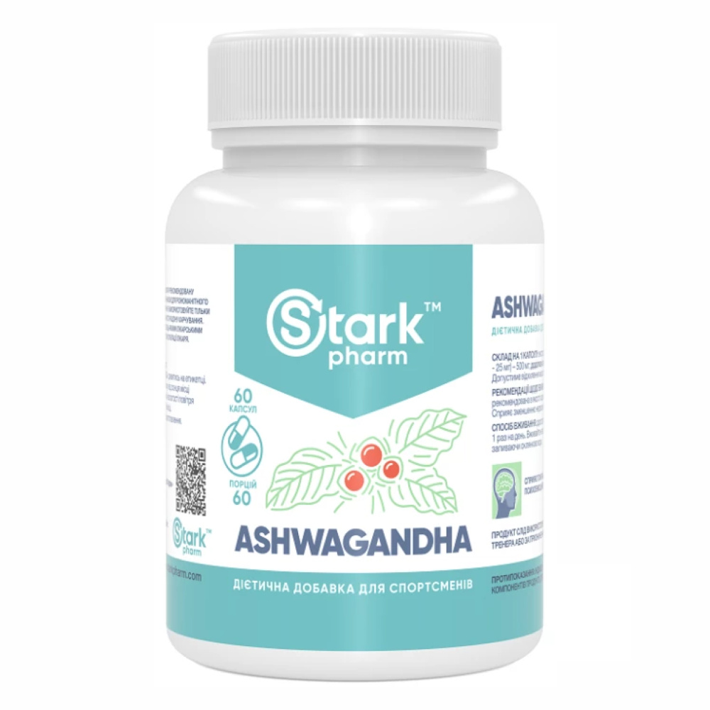 Харчова добавка Stark Pharm - Stark Ashwagandha містить 5% екстракту ашвагандхи, який використовується як тонізуючий та адаптогенний засіб.