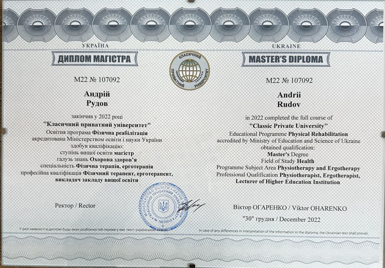 - Класичний приватний Університет, програма "Фізична реабілітація", ступінь магістра за спеціальністю "Фізична терапія, ерготерапія".