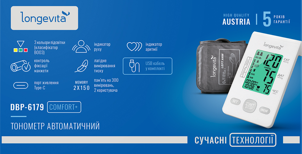 Автоматичний тонометр Longevita DBP-6179 – відноситься до серії Comfort+.