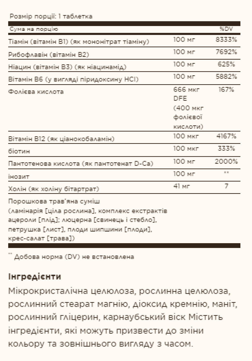 Не містить глютену, пшениці, молочних продуктів, сої, дріжджів, цукру, натрію, штучних ароматизаторів, підсолоджувачів, консервантів і барвників.