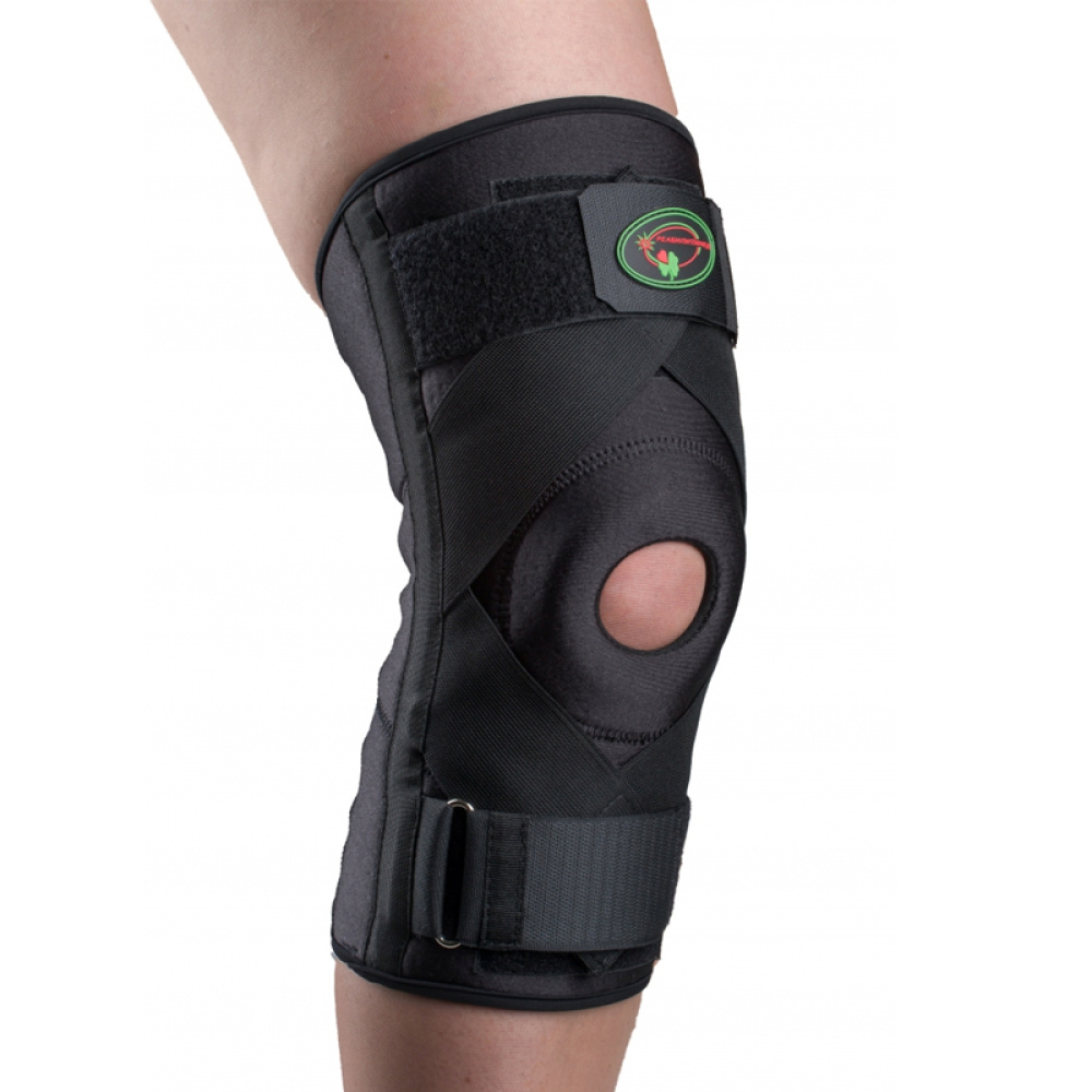 Кільцеподібний пружний пателярний контрфорс (силіконове валик-кільце, вшите всередину наколінника) має внутрішній діаметр трохи більший, ніж розмір колінної чашечки і, огинаючи її по зовнішньому контуру, стабілізує колінну чашечку в правильному анатомічному положенні, знижує больові відчуття і додатково захищає суглоб спереду. Хрестоподібні застібки з ременями затяжками над і під кільцем створюють додаткову стабілізацію з латеральної і медіальної сторони суглоба.
