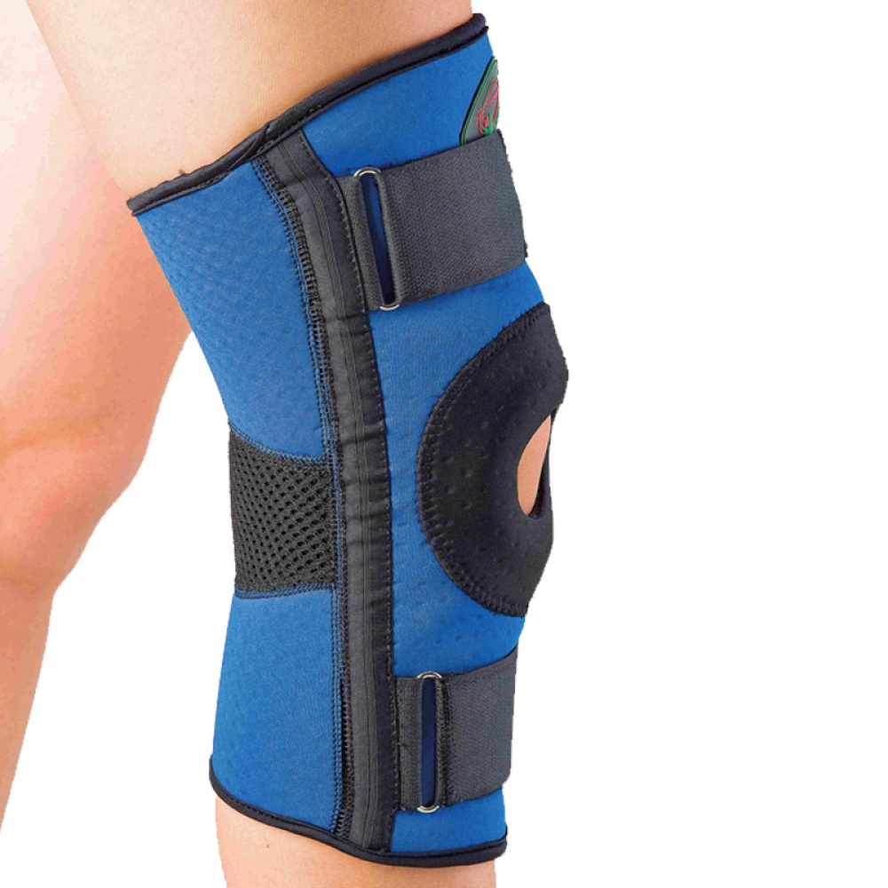 Кільцеподібний пружний пателярний контрфорс (силіконове валик-кільце, вшите всередину наколінника) має внутрішній діаметр трохи більший, ніж розмір колінної чашечки і, огинаючи її по зовнішньому контуру, стабілізує колінну чашечку в правильному анатомічному положенні, знижує больові відчуття і додатково захищає суглоб спереду. Матеріал ортеза, аеропрен, забезпечує рівномірну компресію і мікромасаж колінного суглоба, володіє теплозберігаючим ефектом, сприяє поліпшенню кровообігу, стимулює процеси відновлення м'язів і зв'язок. Плоскі пружини з оцинкованої сталі розташовані з боків суглоба захищають коліно, обмежуючи латеральну рухливість, полегшують розгинання і при цьому не перешкоджають нормальній амплітуді рухів.