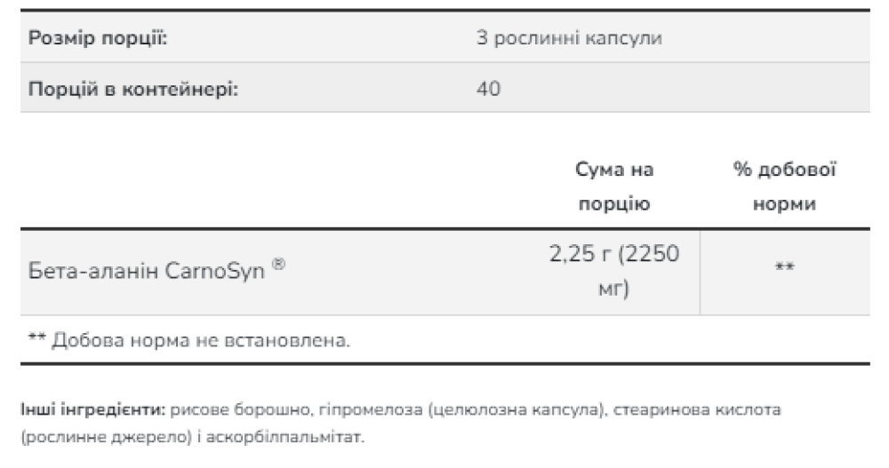Бета-аланін — це незамінна амінокислота, яка використовується м’язовими клітинами для синтезу карнозину. Карнозин — це дипептид (бета-аланін плюс гістидин), який діє як буфер для іонів водню (кислоти), що утворюються під час напружених фізичних вправ, допомагаючи підтримувати оптимальний pH м’язів. NOW Sports використовує CarnoSyn®, запатентовану форму бета-аланіну, яка була клінічно протестована та доведена, що підвищує вміст карнозину в м’язах, тому м’язи можуть ... Можливість працювати більше та довше завдяки інтенсивним тренуванням. NOW® Sports Beta-Alanine підтримується науковими дослідженнями, які показують, що CarnoSyn® призводить до відстроченої втоми м’язів і швидкого відновлення, допомагаючи вам досягти ваших цілей у тренуванні сили та витривалості.