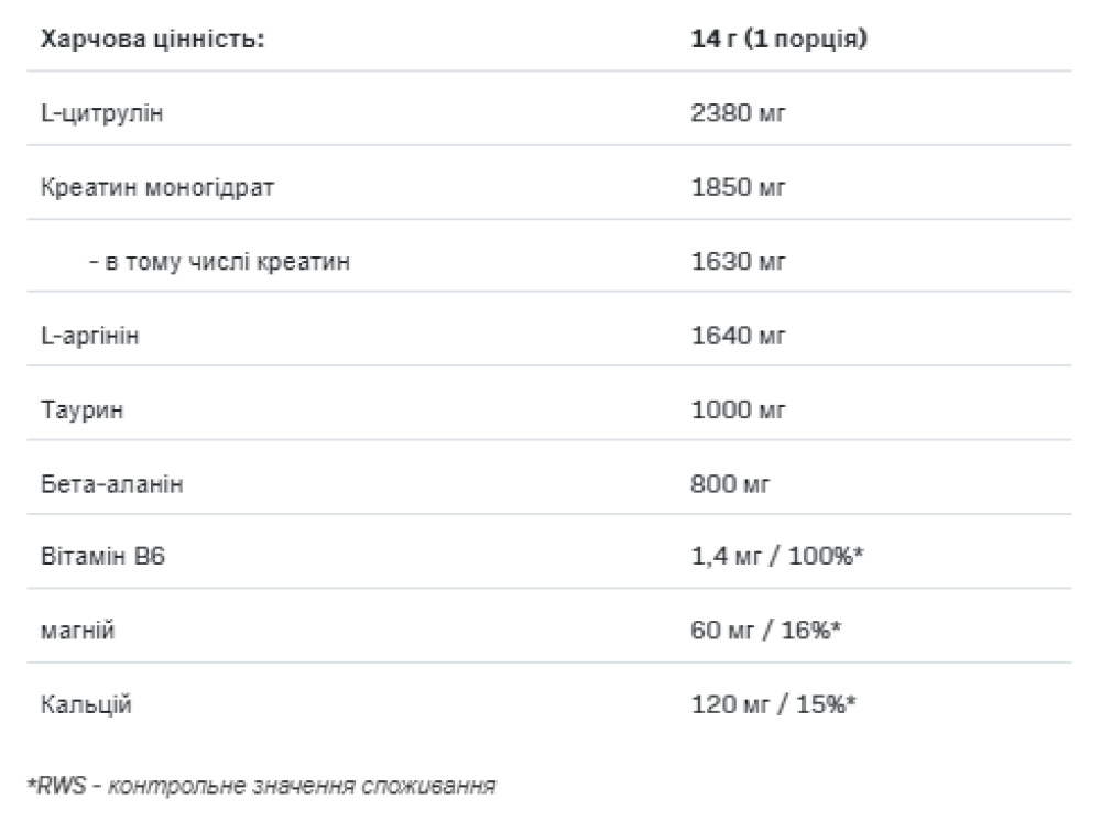 Весь продукт збагачений таурином, який сприяє засвоєнню креатину, також відомого своєю антикатаболічною дією на руйнування м’язів і підтримку анаболічних процесів.