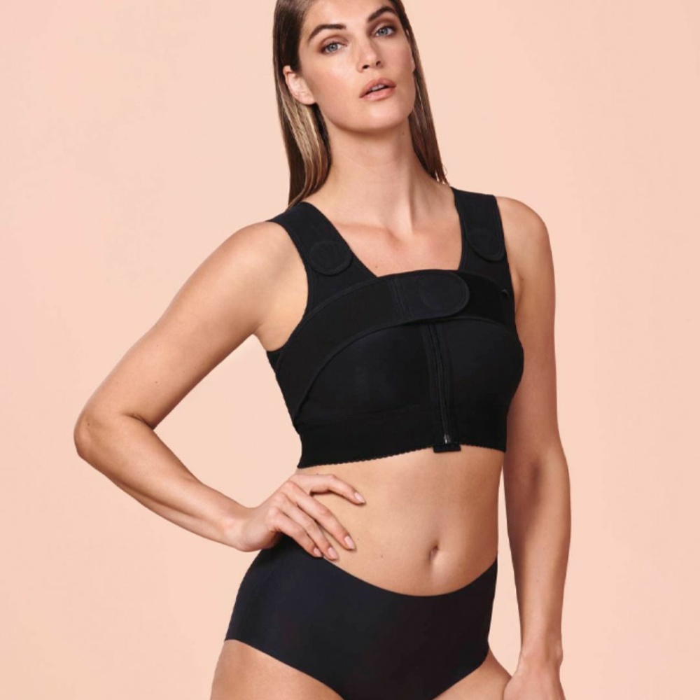 Тканина/дизайн Безшовні формовані чашки виконані з двошарового бавовняного трикотажу. Бічна підтримуюча панель забезпечує дозовану компресію збоку в нижній частині грудей. Бретелі легко регулюються за допомогою застібки-липучки. Застібка на гачок полегшує застібання блискавки. Під грудьми - широка еластична стрічка з бавовною до тіла. 60% СО, 25% EL, 10% PA, 5% PES Показання Після пластичних операцій на молочній залозі. Після секторальної резекції та квадрантектоміі. Принцип дії Контрольована компресія в області рубця. Фіксація імплантатів попереджає їх зміщення. Особливі функції Оптимальна стабілізація форми і забезпечення нерухомості прооперованої молочної залози після будь-яких пластичних операцій. Сприяє процесу одужання за допомогою контрольованої компресії в області рубця і нормалізації лімфовідтоку. Запобігає тиск і роздратування тканин завдяки точності посадки і сумісності зі шкірою. Простий в застосуванні як для пацієнтки, так і для медичного персоналу.