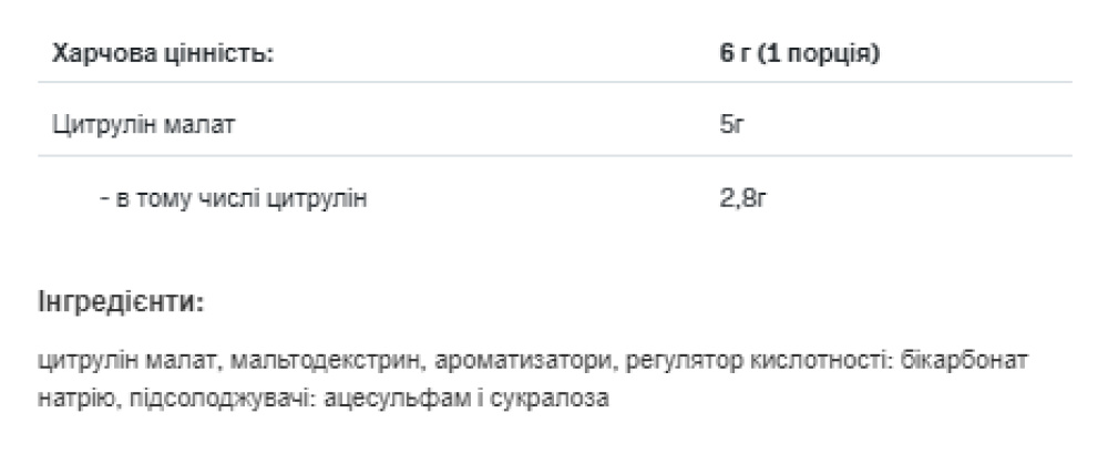 ІНГРЕДІЄНТИ Цитрулін Зміст на одну порцію зміст: Цитрулін малат 5 г - з них цитрулін 2,8 г