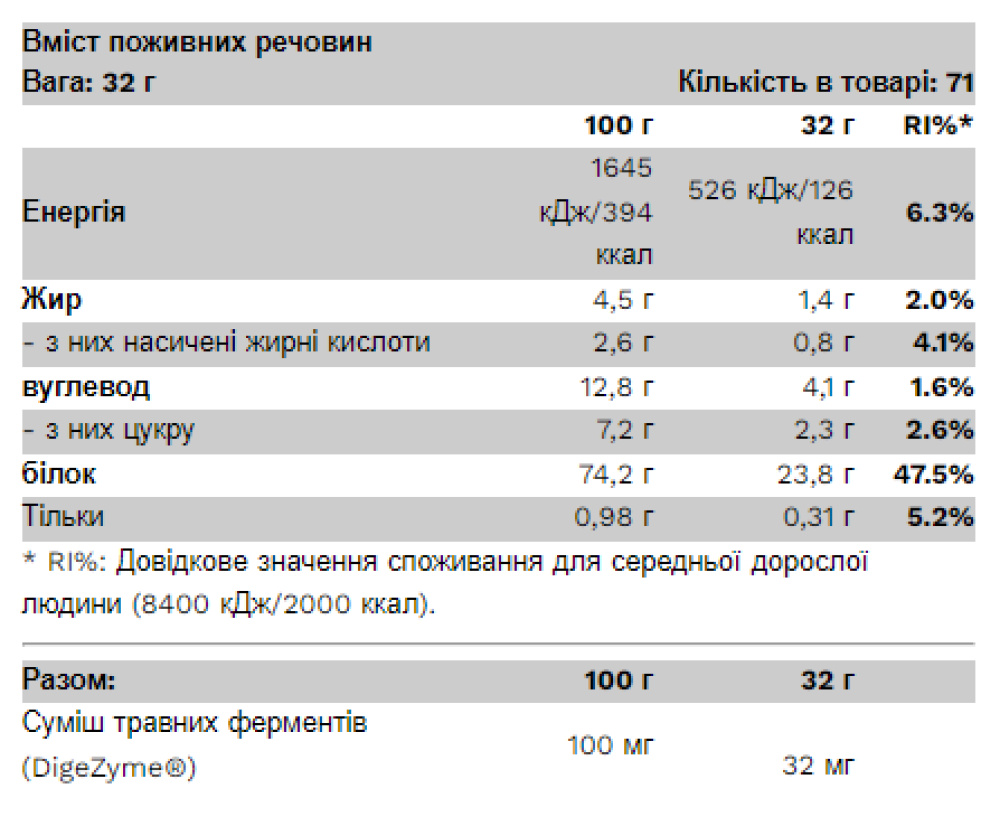 Інгредієнти (Шоколадний фундук): мікрофільтрований концентрат сироваткового білка (з молока, інстантизований соняшниковим лецитином), мікрофільтрований концентрат сироваткового білка (з молока, інстантизований соєвим лецитином), L-гліцин, сухе знежирене молоко, мальтодекстрин, какао-порошок зі зниженим вмістом жиру, ароматизатори (шоколадний смак, аромат лісового горіха), хлорид натрію, загущувач (ксантанова камедь), L-таурин, L-глутамін, підсолоджувачі (ацесульфам К, сукралоза), ферментний комплекс Digezyme® (альфа-амілаза, нейтральна) протеаза, целюлаза, лактаза, ліпаза)