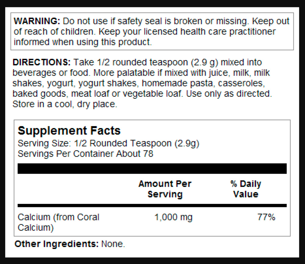 Обговорення: кальцій з низькою молекулярною масою, такий як карбонат кальцію з коралів, потенційно може поглинатися неушкодженим або іонізованим шлунковими кислотами. Неназальний іонізований кальцій впливає на проникність мембран і регуляцію ферментів. Кальцій також відіграє роль у клітинних процесах. Кальцій забезпечує поживну підтримку для здорових кісток і зубів, правильну передачу нервових імпульсів і скорочення м'язів.