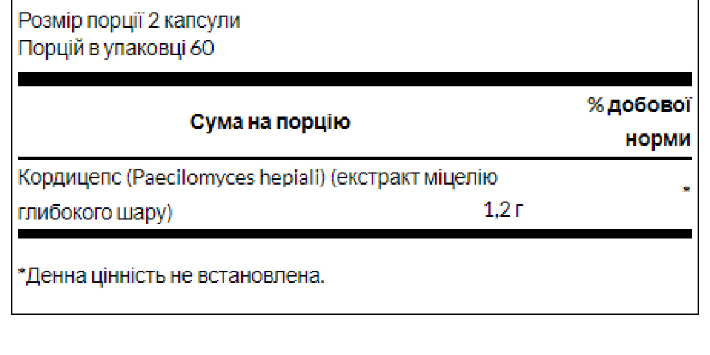 Добавка Swanson Premium Cordyceps є чистим глибокошаровим екстрактом, сертифікованим як не містить дріжджів, плісняви або інших потенційно шкідливих мікробів. Потужна сучасна версія стародавнього китайського секрету, кордицепс - це інтригуюча речовина, яка завойовує всесвітню популярність і визнання як тоніка, що підвищує енергію і зміцнює здоров'я. Нині кордицепс виробляється з допомогою сучасних методів культивування, які, нарешті, зробили його дивовижні поживні властивості доступними західного світу.