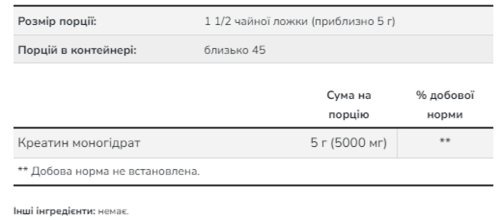 Креатин є сполукою, яка природним чином зустрічається в організмі, головним чином у скелетних м’язах. Функція креатину полягає в тому, щоб служити попередником аденозинтрифосфату (АТФ), форми хімічної енергії, яка використовується всіма клітинами. Запаси креатину в організмі створюють пул легкодоступного АТФ для отримання енергії, необхідної для живлення швидких сплесків енергії та сили. Дослідження показали, що додавання креатину може допомогти зберегти існуючу м’язову тканину, підтримати ріст і розвиток сухої маси, а також сприяти оптимальній продуктивності під час коротких періодів інтенсивних вправ. Креатин моногідрат NOW® легко змішується і не містить добавок або консервантів.
