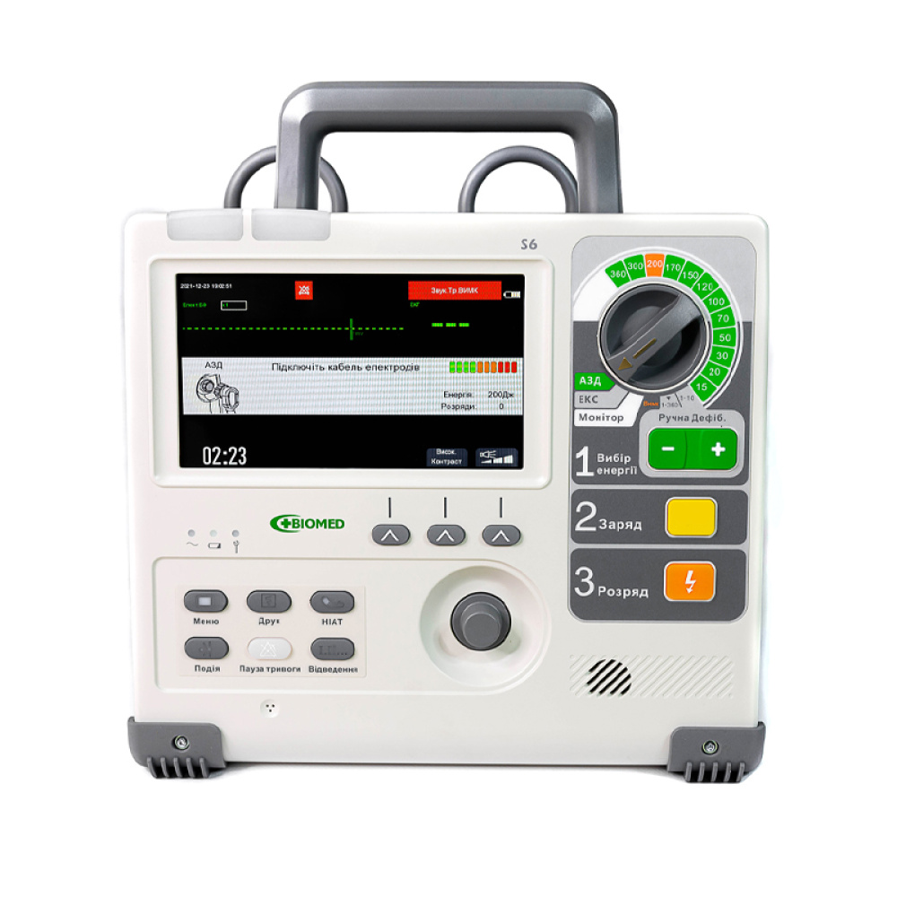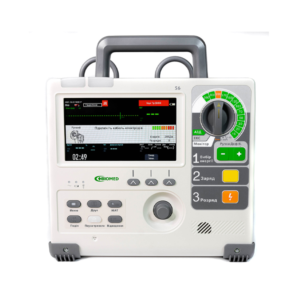 Дефібрилятор-монітор S6 застосовується для дефібриляції в ручному режимі, для дефібриляції в автоматичному режимі АЗД (AED), зовнішньої кардіостимуляції та моніторингу фізіологічних показників життєдіяльності пацієнтів (ЕКГ, ЧСС, ЧД (RESP), SpO2, ЧП, НІАТ, EtCO2).