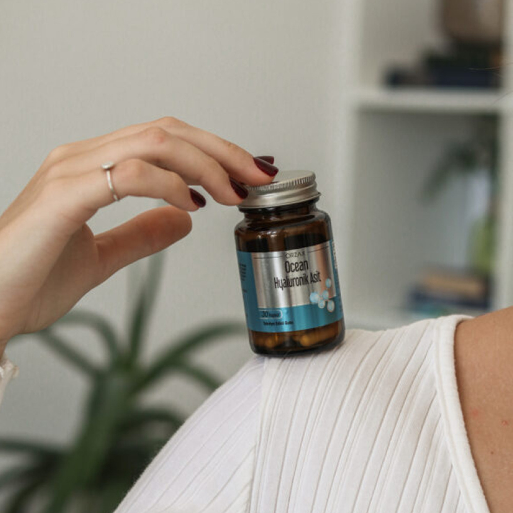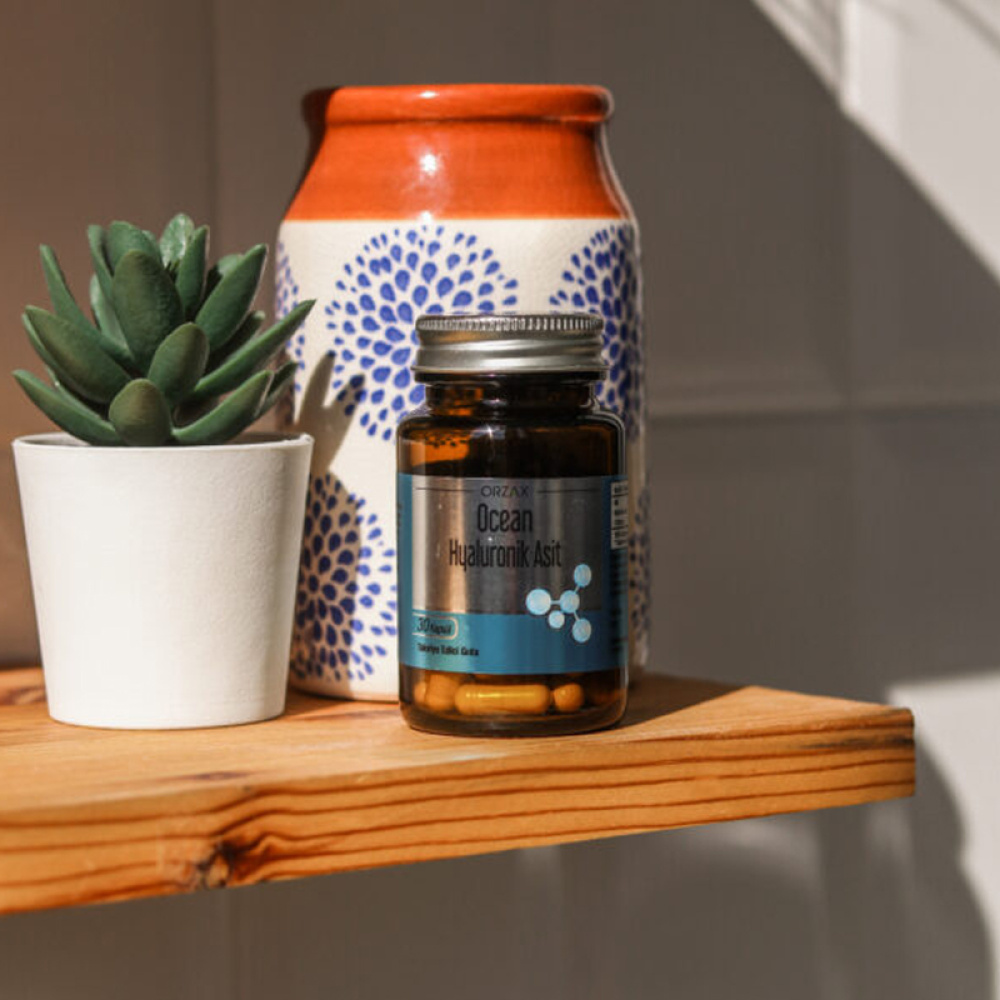 Натрію гіалуронат (гіалуронова кислота), гідроксипропілметилцелюлоза (трав’яна капсула), L-аскорбінова кислота (вітамін C), антизліпні агенти: солі жирних кислот магнію.