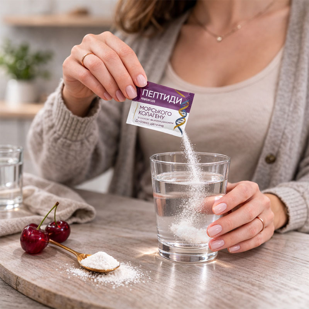 Добавка дієтична «Пептиди морського колагену Powerfood зі смаком вишні з підсолоджувачем» містить високоякісні пептиди колагену I типу Peptolap Fast, створені на основі інноваційних досліджень для максимальної біодоступності, підтримки краси і покращення загального самопочуття. Завдяки високому ступеню очищення Peptolap Fast не має вираженого запаху та смаку, але зберігає всі необхідні властивості для підтримки молодості та енергії.