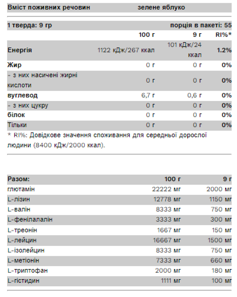 Рекомендоване дозування: змішайте 1 порцію (9 грамів - мірна ложка, наповнена до позначки 15 мл) порошку з 400 мл води. Використовуйте за 30-40 хвилин до тренування і після тренування або перед сном. У дні відпочинку приймайте одну дозу між прийомами їжі. Рекомендується вживати одну або дві порції на день.