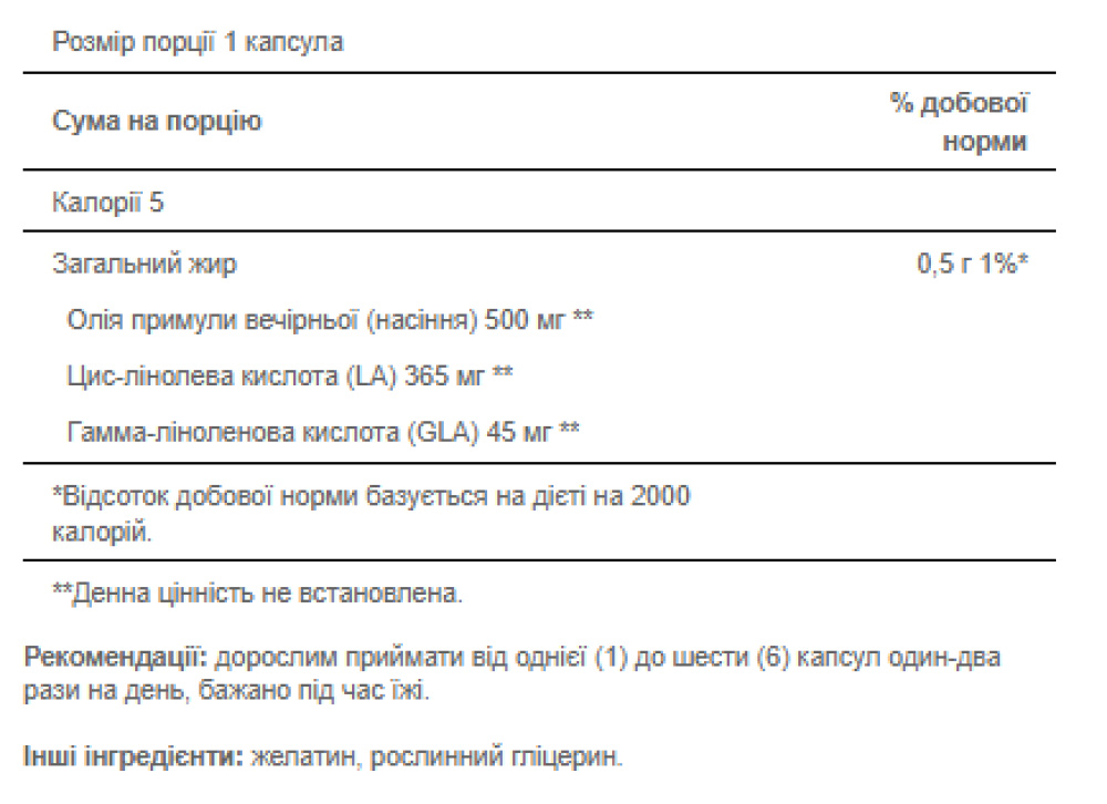 Ці м’які таблетки, які легко проковтнути, є природним джерелом GLA (гамма-ліноленової кислоти). Наш EPO містить одну з найбільш біологічно активних форм цієї омега-6 жирної кислоти, доступної сьогодні. EPO, який використовується для Puritan's Pride, є 100% чистим, не містить розчинників, холодного пресування та не містить залишків гексану та інших розчинників. Усі три потенції (500 мг, 1000 мг або 1300 мг) забезпечують 9% вмісту GLA, що допомагає доставити кількість GLA, необхідну для досягнення корисних результатів.