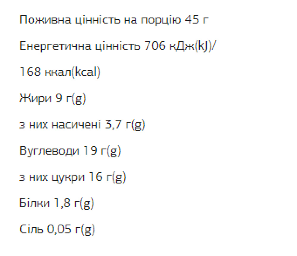 Склад: кокосове печиво (28%) (кокосова стружка (18%), екстракт яблучного соку концентрований), фініки, ядра горіхів мигдалю (16,7 %), шоколадна глазур (11%) (терте какао, підсолоджувач мальтит, какао масло, какао порошок зі зниженим вмістом жиру, емульгатор лецитин, натуральний ароматизатор ваніль).