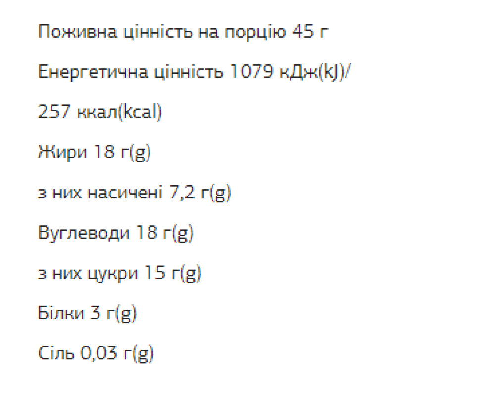 Склад: фініки, ядра горіхів фундука (24 %), карамель (24%) (екстракт кокосу, екстракт яблучного соку концентрований, крохмаль кукурудзяний) шоколадна глазур (11%) (терте какао, підсолоджувач мальтит, какао масло, какао порошок зі зниженим вмістом жиру, емульгатор лецитин, натуральний ароматизатор ваніль), рожева гімалайська сіль.
