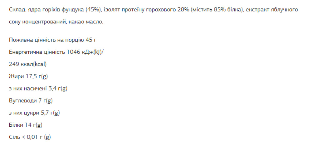 Склад: ядра горіхів фундука (45%), ізолят протеїну горохового 28% (містить 85% білка), екстракт яблучного соку концентрований, какао масло.