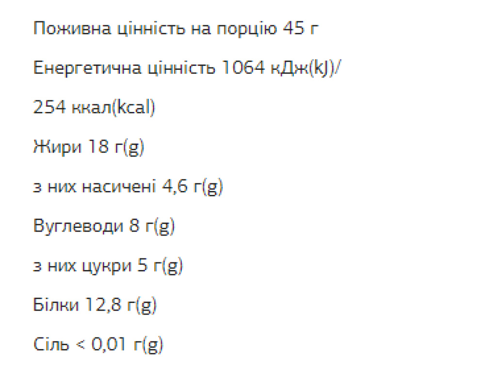 Склад: ядра горіхів фундука (40%), ізолят протеїну горохового 25% (містить 85% білка), екстракт яблучного соку концентрований, шоколадна глазур (11%) (терте какао, підсолоджувач мальтит, какао масло, какао порошок зі зниженим вмістом жиру, емульгатор лецитин, натуральний ароматизатор ваніль).