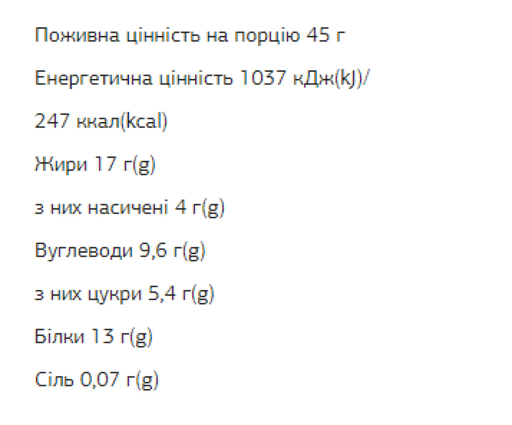 Склад: ядра бобів арахісу (25,2%), шоколад (15,8%) (терте какао, підсолоджувач мальтит, какао масло, какао порошок зі зниженим вмістом жиру, емульгатор лецитин, натуральний ароматизатор ваніль), екстракт яблучного соку концентрований, ізолят протеїну горохового 13,8% (містить 85% білка).