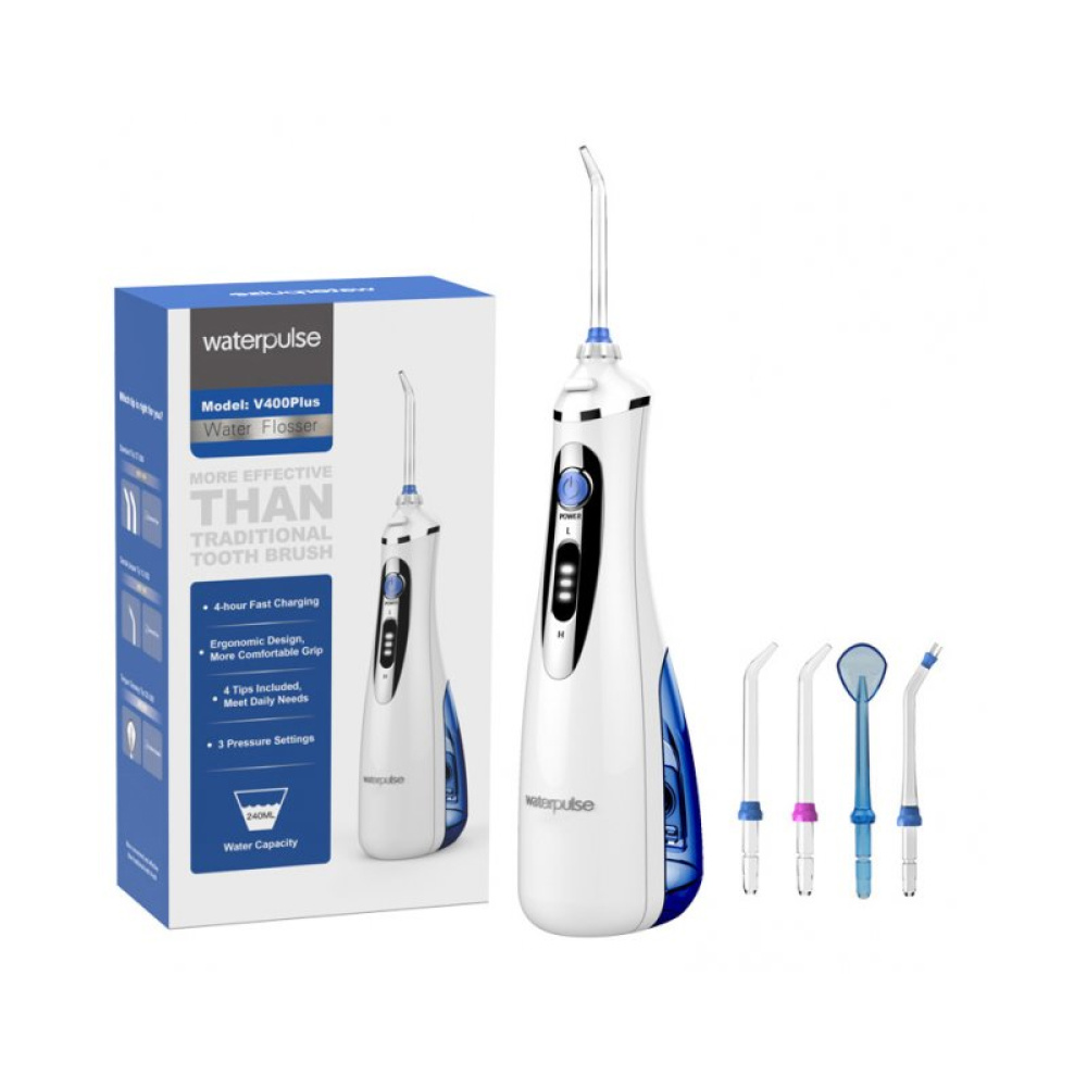 Портативний іригатор Waterpulse V 400 це інноваційний пристрій для гігієни порожнини рота, який на практиці повною мірою демонструє, наскільки очищення порожнини рота за допомогою іригаційного струменя ефективніше чищення звичайними гігієнічними засобами (мануальними щітками). Нова модель Waterpulse V400 відрізняється компактністю і високими технічними характеристиками (а саме потужністю яка досягає 580 кПа, і наявністю комплекту насадок з 4шт., що значно розширює функціональність іригатора).