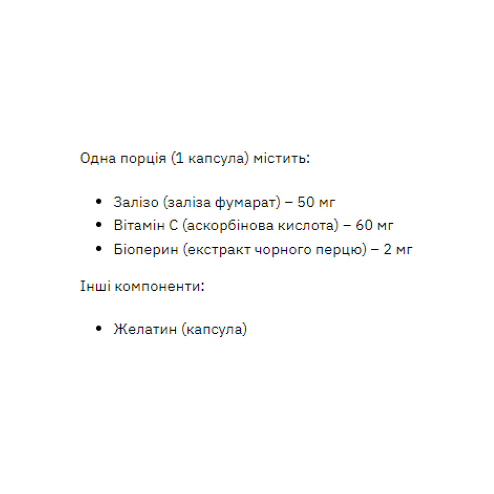 Харчова добавка містить залізо у формі фумарату, доповнене вітаміном C та біоперином (екстракт чорного перцю). Заліза фумарат має високу біодоступність, тобто він легко засвоюється організмом. Наявність вітаміну C в складі добавки сприяє кращому засвоєнню заліза.