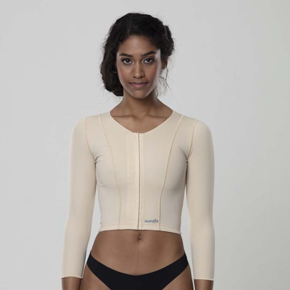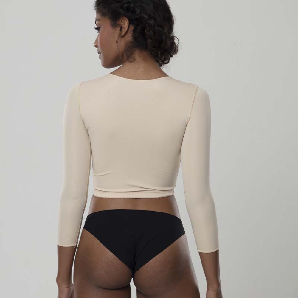 Спеціально розроблена блуза для відновлюваного періоду після ліпосакції рук і спини. Модель має застібку на гачках з трьома планками петель і занижену лінію ворота, що дозволяє носити бандаж під звичайним одягом.