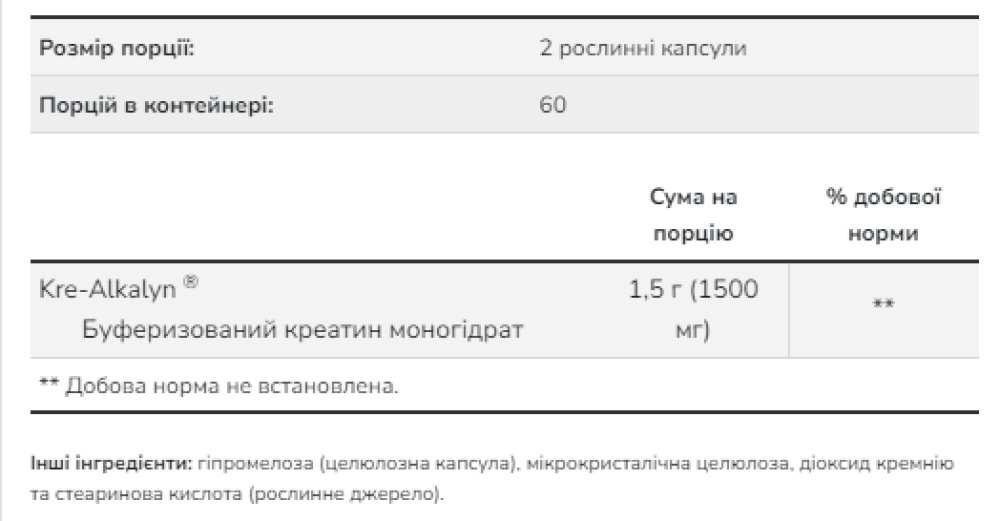 Креатин — це сполука, яка природним чином зустрічається в організмі, насамперед у скелетних м'язах. Функція креатину у тому, щоб бути попередником аденозинтрифосфата (АТФ), форми хімічної енергії, використовуваної усіма клітинами. Запаси креатину в організмі створюють запас доступної АТФ для отримання енергії, яка необхідна для швидкого збільшення потужності й сили. Дослідження довели, що прийом добавок з креатином може допомогти підтримувати здоров'я м'язової тканини, підтримувати ріст і розвиток м'язової маси та сприяти оптимальній продуктивності під час коротких інтенсивних вправ. Моногідрат креатину компанії NOW® не містить добавок чи консервантів.