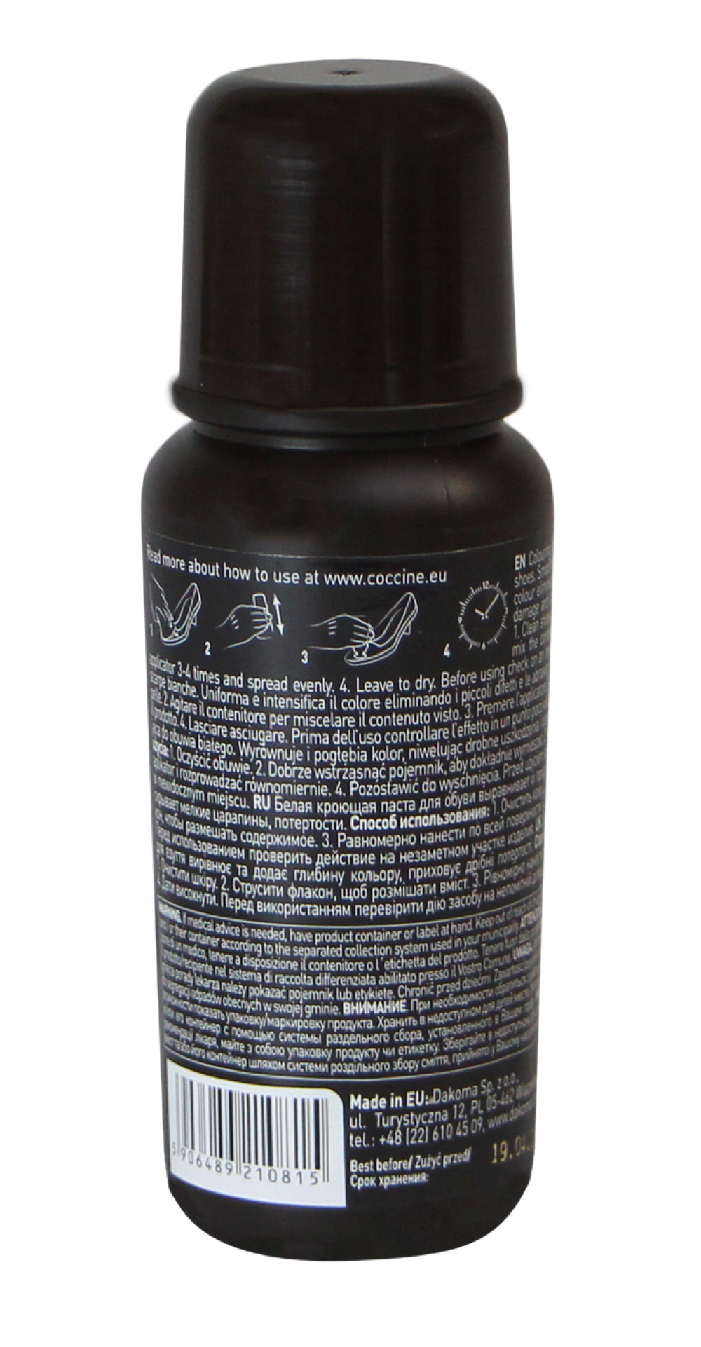 Белая крем-паста предназначена для восстановления цвета изделий из гладкой кожи, выравнивает и углубляет белый цвет, уменьшает потертости и повреждения. Также можно использовать для изделий из текстиля, идеально подходит для восстановления цвета белой подошве. Способ применения: очистите поверхность изделия, интенсивно встряхните флакон перед применением, попробуйте действие препарата на незаметном участке, нажмите аппликатором-губкой на поверхность изделия 3-4 раза и равномерно распределите средство по поверхности, дайте высохнуть. Для закріплення ефекту обробіть виріб додатково водовідштовхувальним спреєм Coccine Antiacqua або Coccine Tourist Water Stop.