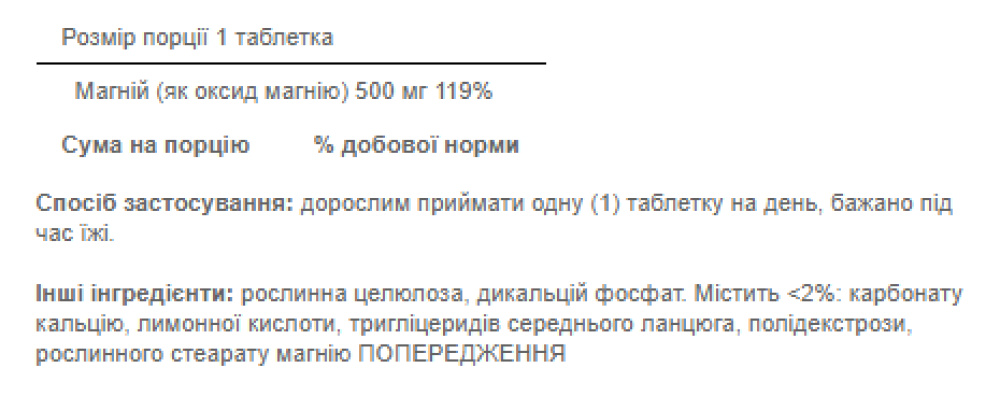 Дозування таблетки магнію 500 мг, що рекомендується, приймайте по одній таблетці на день, бажано під час їжі.