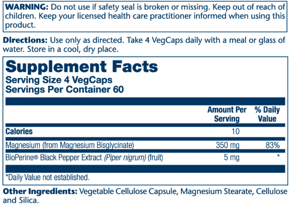 Цей продукт містить 350 мг магнію у високозасвоюваній формі гліцинату. Магній - це важливий мінерал, який бере участь у багатьох життєво важливих процесах в організмі, включаючи виробництво енергії, функцію м'язів і нервів, а також здоров'я кісток.
