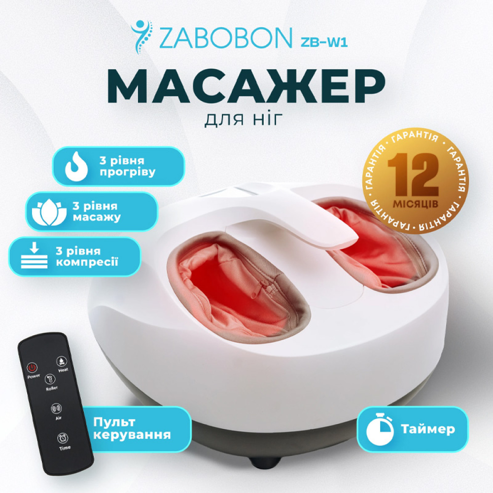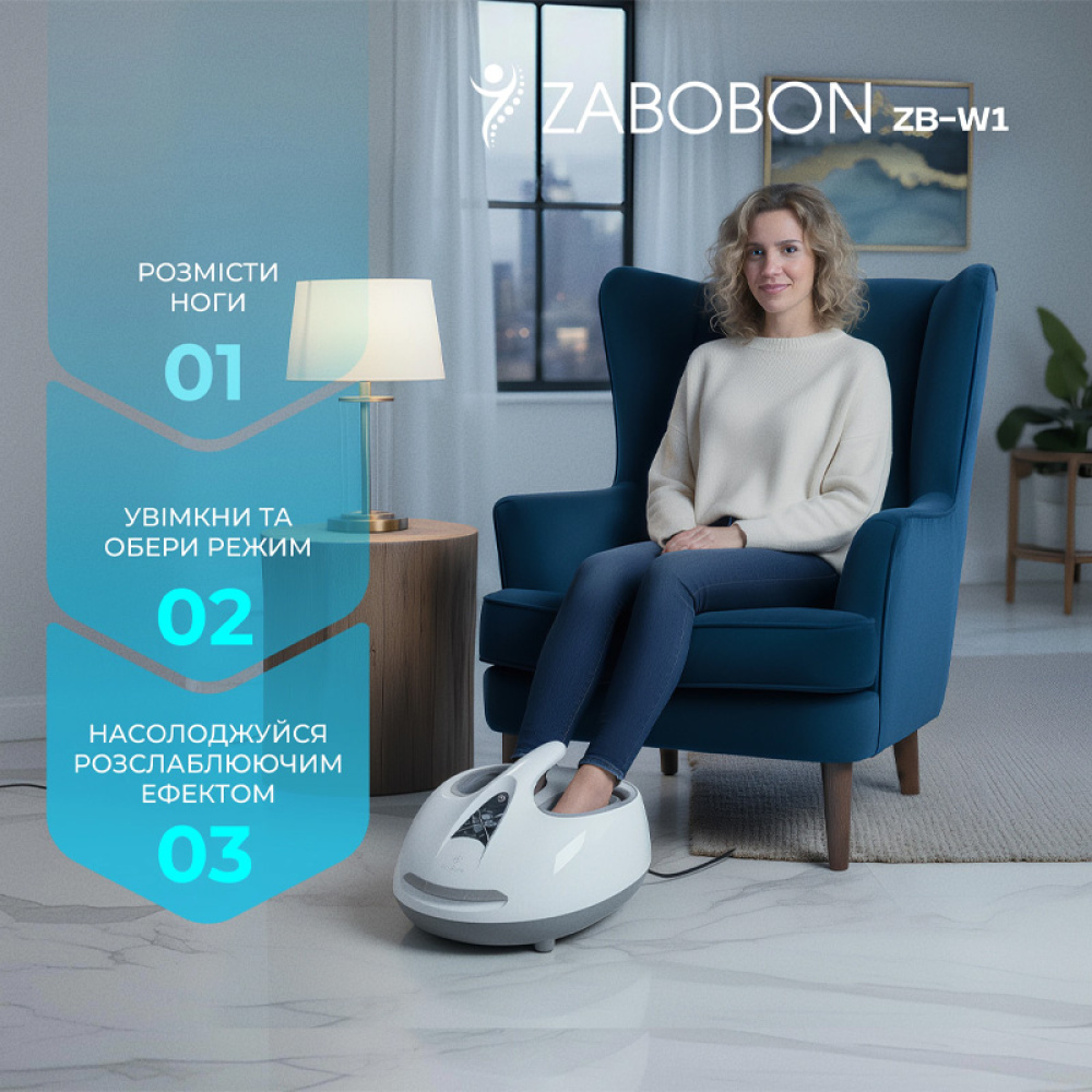 Zabobon ZB-W1 - масажер для стоп із теплим прогрівом і ритмічною компресією. Швидко знімає втому, важкість і набряклість після робочого дня чи тренування. 10-15 хвилин - і ногам знову легко.