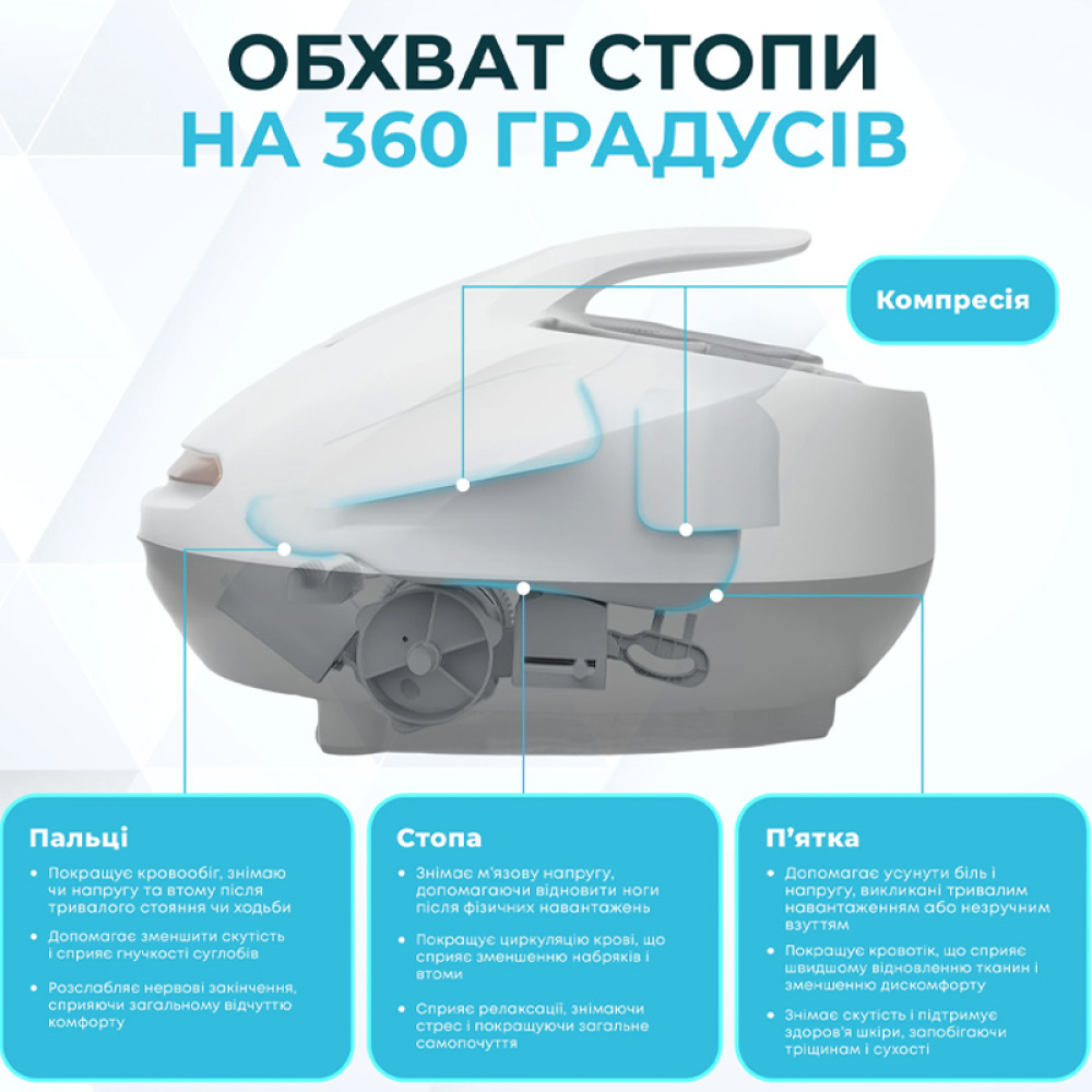 Кілька рівнів інтенсивності: від м’якого релаксу до глибшого впливу. Ергономічна конструкція охоплює ключові зони стопи, знімні текстильні вкладиші легко чистити.