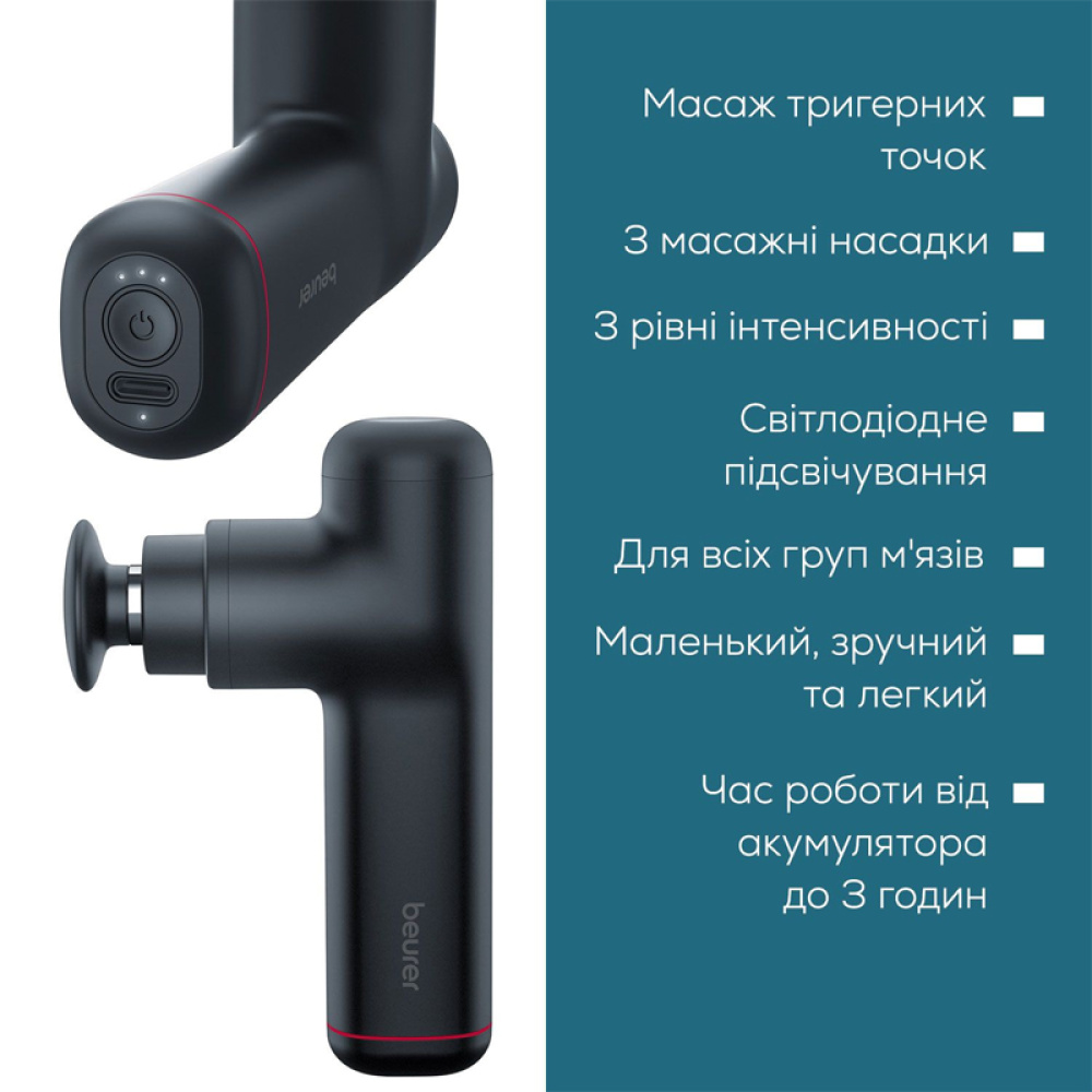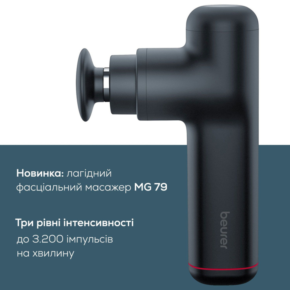 Beurer MG 79 — це багатофункціональний ударний масажер, який забезпечує інтенсивний і глибокий масаж різних частин тіла. Його поєднання перкусійного масажу та функції інфрачервоного тепла робить пристрій ідеальним для зняття м’язової напруги, полегшення болю та стимуляції кровообігу.