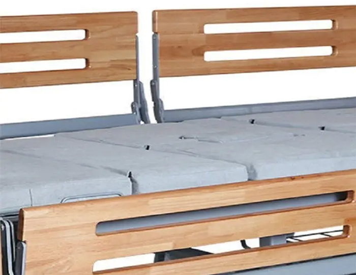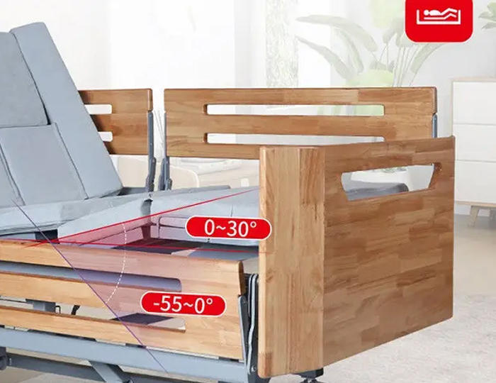Положення секції ніг -55 / 30⁰. Ножна частина ліжка піднімається вгору приблизно на 55 / 30⁰. Сприяє поліпшенню кровообігу ніг, запобігає варикозному розширенню вен і легко дозволяє проводити щоденний догляд.