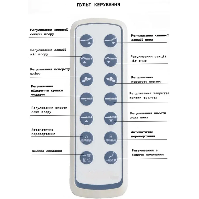 За допомогою електричного управління полегшується повсякденний догляд за лежачим. Пульт управління кріпиться на поручні, в тому місці де зручно пацієнту.