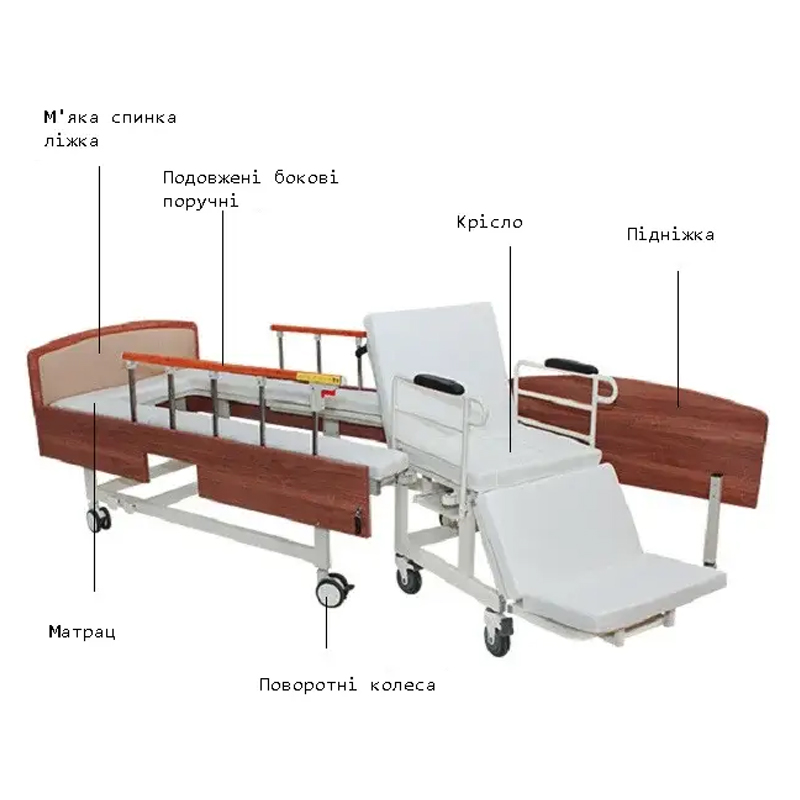 Медичне ліжко, модель W02, оснащене функцією мобільного крісла і також туалетним пристроєм.
