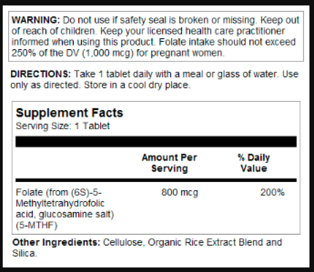 Інформація про продукт. Метилфолат від KAL містить (6S)-5-Метилтетрагідрофолат (5-MTHF). Фолієва кислота призначена для забезпечення поживної підтримки нормального здорового синтезу ДНК, метаболізму гомоцистеїну та роботи серцево-судинної системи. Жінка, яка дотримується здорового харчування та має достатню кількість фолату в організмі, може знизити ризик народження дитини з вродженим дефектом головного або спинного мозку. Для вагітних жінок споживання фолату не повинно перевищувати 250 % від добової норми (1000 мкг).