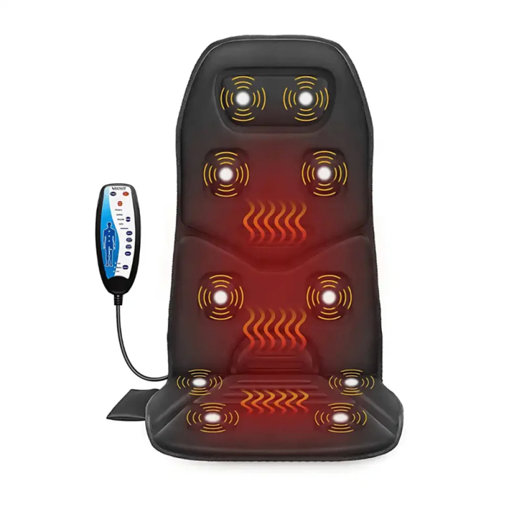 Автомобільна масажна накидка з вібромасажем та функцією підігріву, призначена для розслаблення плечей, спини та стегон під час роботи, відпочинку або поїздок. Має декілька програм, регулювання інтенсивності та автоматичне вимкнення.