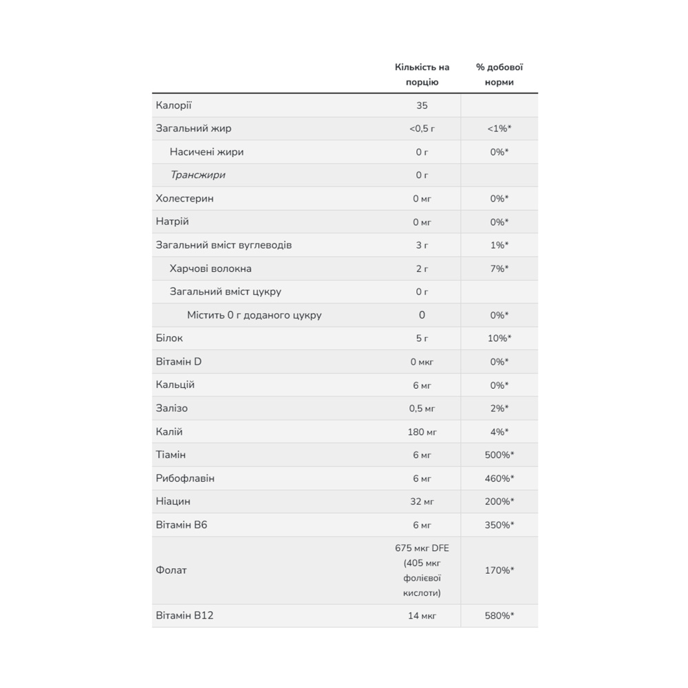 Склад: сухі дріжджі, ніацин, піридоксину гідрохлорид (B6), рибофлавін, тіаміну гідрохлорид (тіамін), фолієва кислота, кобаламін (B12).