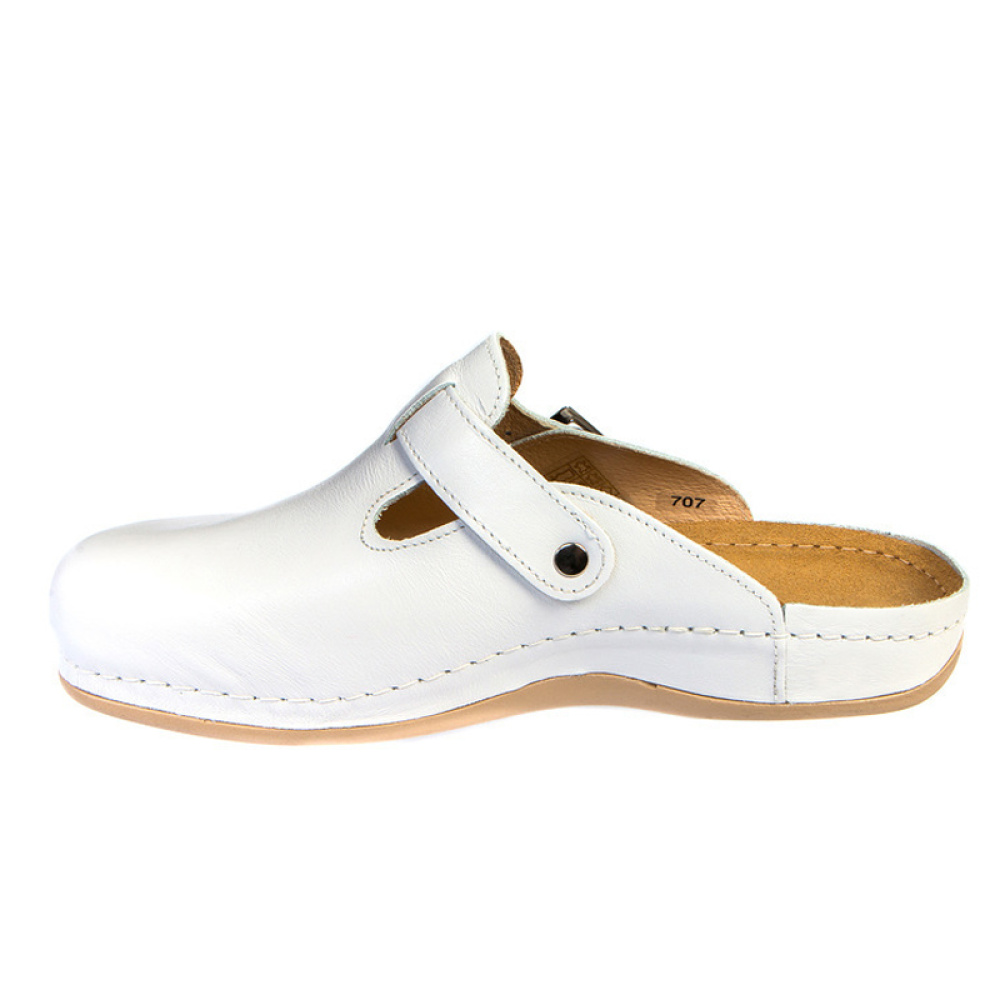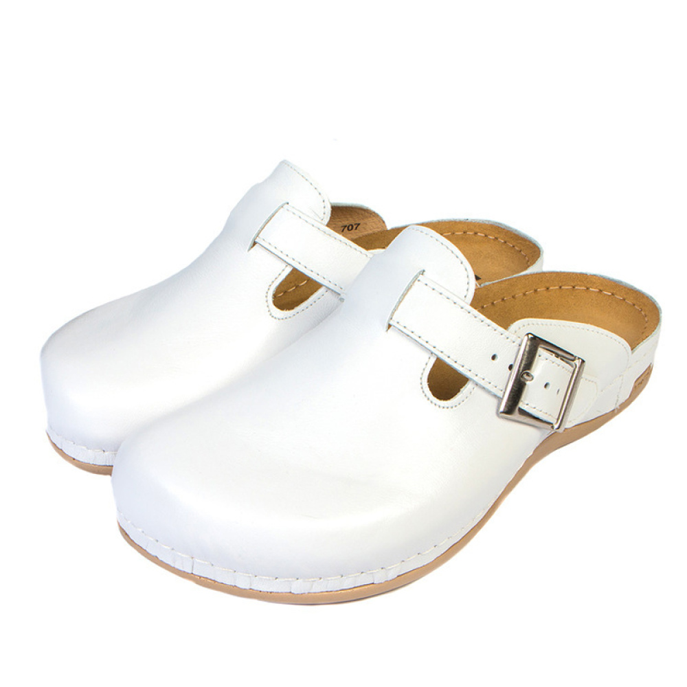 707М - стильні сабо з натуральної шкіри виглядають воістину елегантно і по-діловому актуально. Ремінець дозволяє регулювати повноту і розбавляє образ легким відтінком неформальності. Такі сабо чудово підійдуть для повсякденного носіння, для офісної обстановки, як прогулянковий варіант. Довговічність, надійність, зручність, анатомічні та Анатомичні властивості - ось базис сабо 707М.