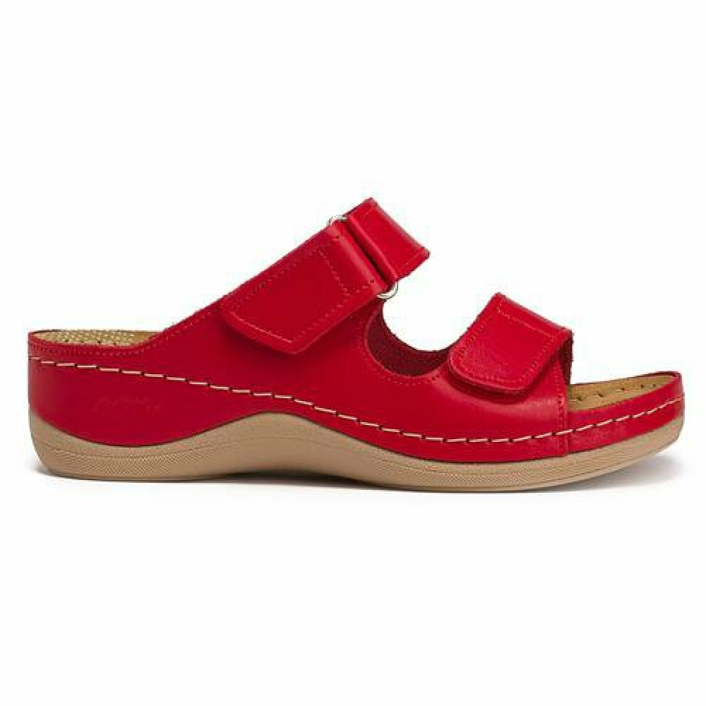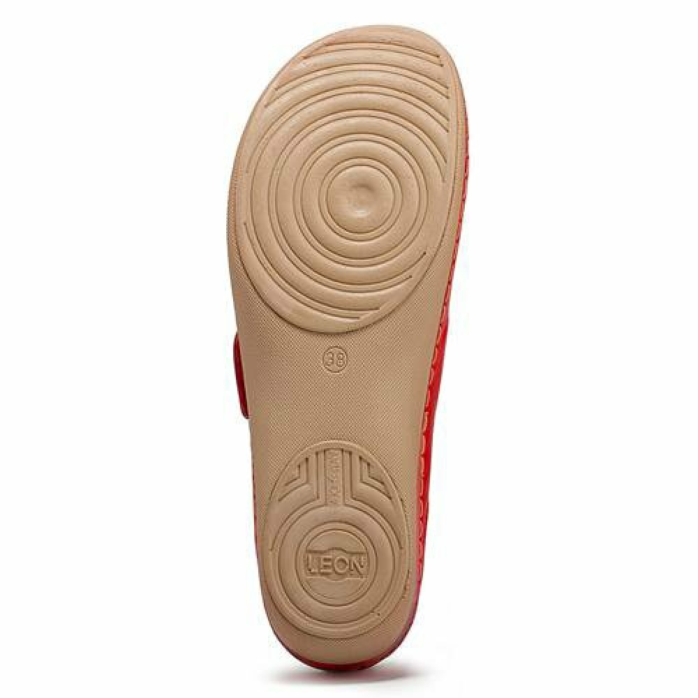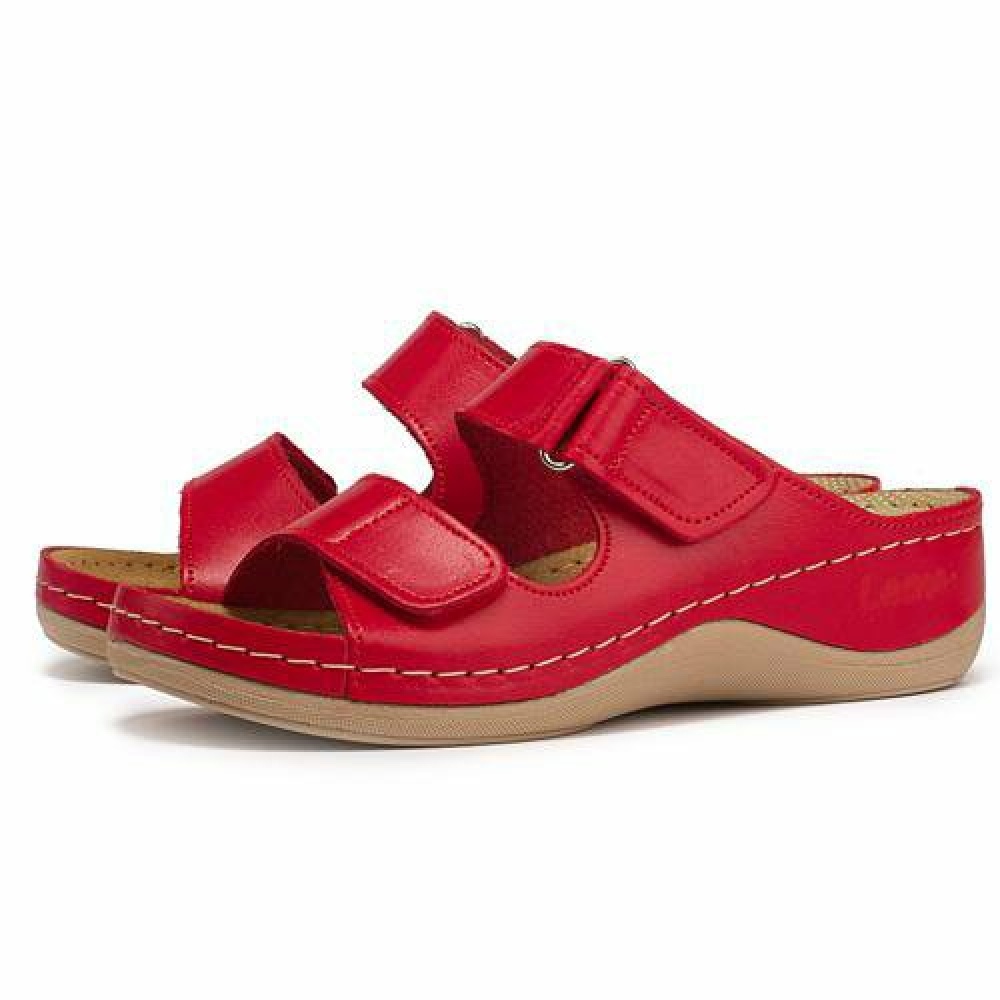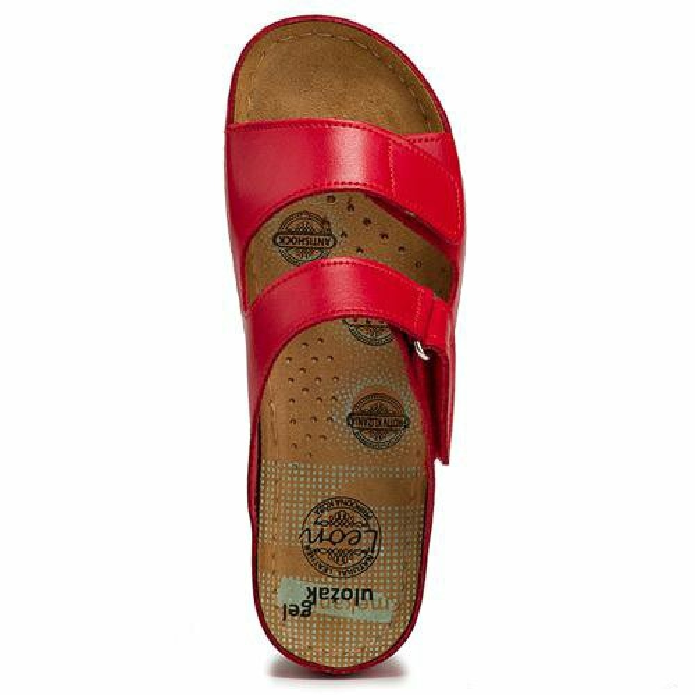 Верхня частина і підкладка жіночих ортопедичних тапочок-сабо Леон 905 виготовлена з натуральної шкіри байкаст. Вона стійка до вицвітання, тому яскравий червоний колір збережеться довгі роки, не дивлячись на використання при пекучому сонці. Каблук висотою 4,5 см і платформа 2 см - це ідеальне поєднання для того, щоб ортопедичне сабо було комфортним в застосуванні і добре виглядало на ніжці. Верхня частина каблука також обшита шкірою, за рахунок чого взуття виглядає елегантно.