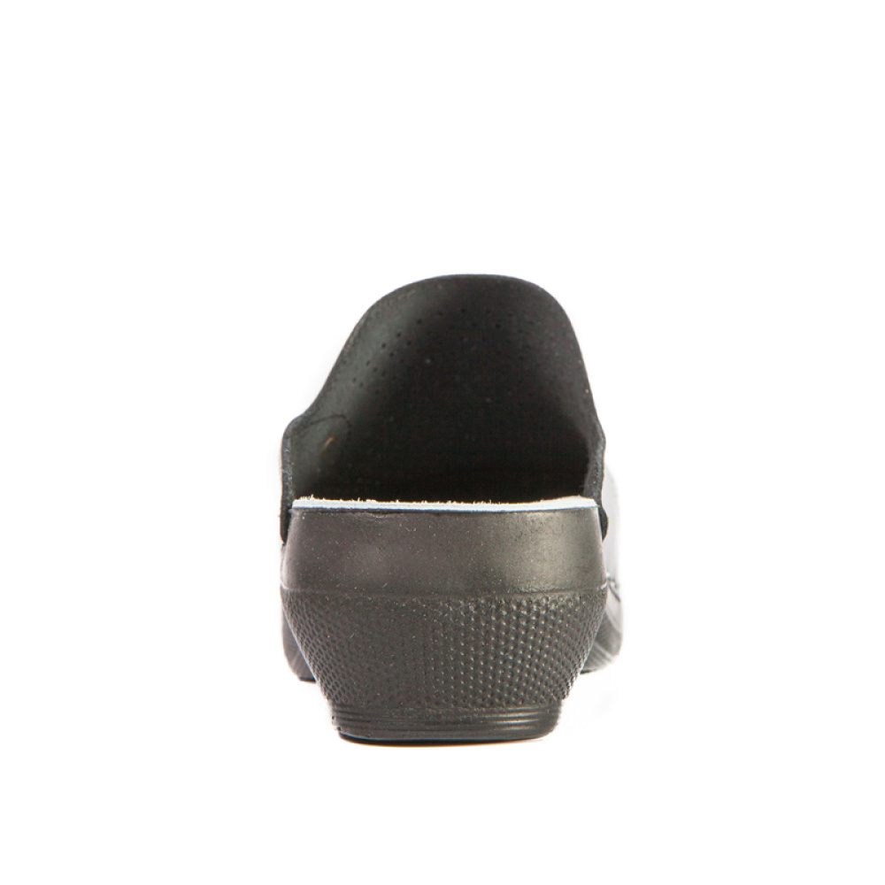 Жіночі сабо PU115 (чорні) є зручною моделлю, призначеною для щоденного використання тим, хто багато часу змушений проводити на ногах. Легка підошва виготовлена з поліуретану, який славиться своїми еластичними властивостями і амортизацією, відмінно «вбирає» ударні та вібраційні навантаження при ходьбі або бігу. Анатомічна конструкція дозволяє рівномірно розподілити навантаження на всі ділянки стопи, що тут же знижує загальну стомлюваність ніг і сприятливо позначається на роботі хребта і суглобів. Невеликий каблук візуально полегшує сабо і відповідає за стійкість взуття. Натуральна шкіра, з якої виготовлені верх і підкладка, також позитивно впливають на комфорт і зручність.