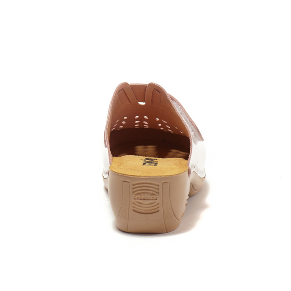 Модель має неслизьку антистатичну підошву з поліуретану, що перешкоджає сильному ударному навантаженню на суглоби під час ходьби. Жіночі сабо 161 виконані з натуральної шкіри високої якості. Функціональним елементом дизайну моделі виступає ремінець, що дозволяє фіксувати взуття по стопі. Закритий носок має перфорацію, що створюють оригінальне оформлення і суттєво поліпшують повітропроникність взуття.