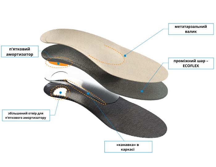 Устілка з помірною викладкою склепінь та розширеним метатарзальним валиком підтримує склепіння та раціонально перерозподіляє навантаження по стопі.