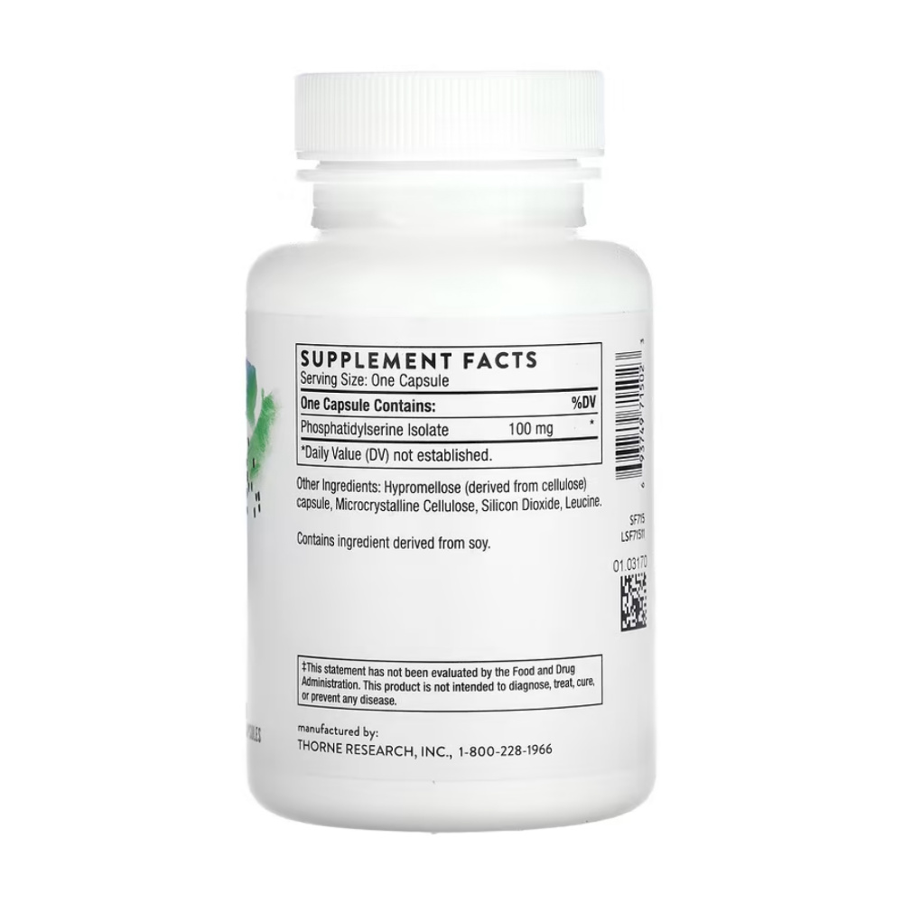 Фосфатидилсерин від Thorne містить фосфатидилсерин (ФС), основний фосфоліпід у клітинних мембранах мозку. PS покращує обмін речовин між клітинами, підтримує пам’ять і концентрацію, а також допомагає регулювати рівень кортизолу під час стресу.
