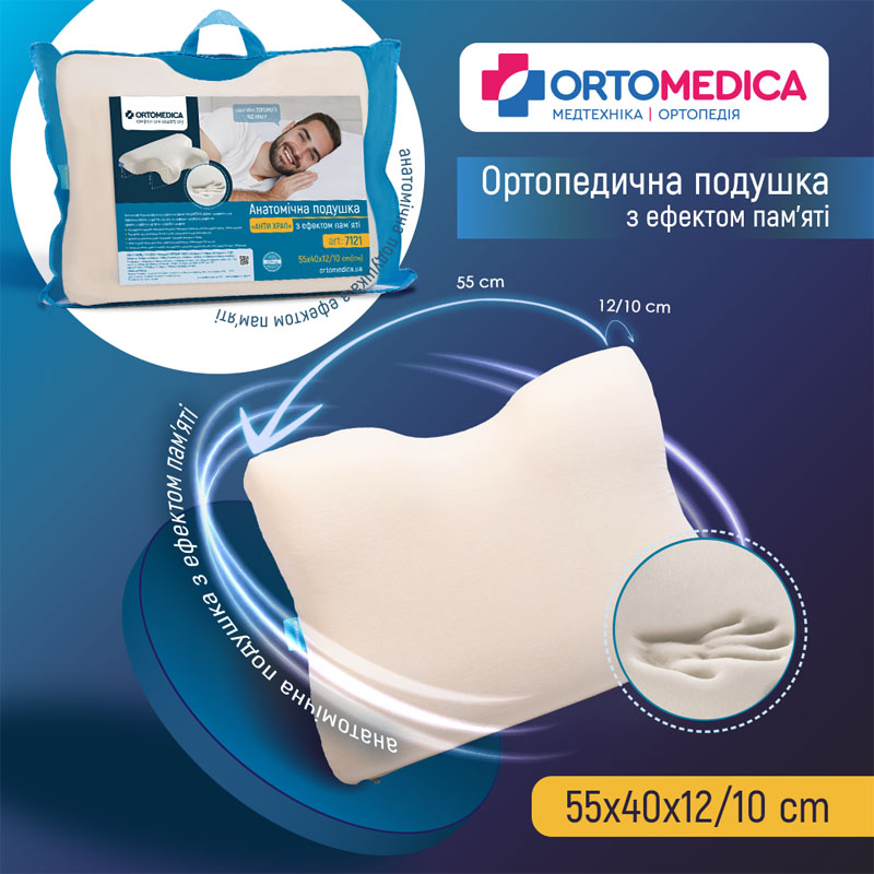 Подушка Анатомічна Ortomedica 7121 від храпу з ефектом пам'яті (55*40*12/10 см)