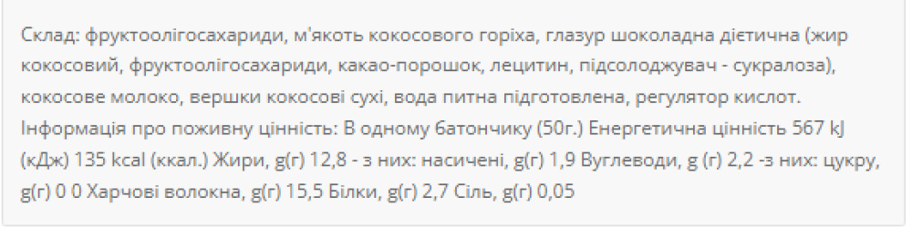 Якщо Вам важко відмовитись від солодкого, внесіть у меню батончик спортивного харчування Coconut Bar. Здорова альтернатива, яка не шкодить фігурі, зберігаючи ваші ідеальні форми – це COCONUT BAR. Батончик абсолютно не містить цукор та глютен. Смак кокосу в дієтичній шоколадній глазурі вгамує бажання з'їсти солодке, не порушуючи правила раціону. Смачний та корисний, з високим вмістом клітковини, цей батончик не дасть зірватися з дієти та подарує море насолоди.